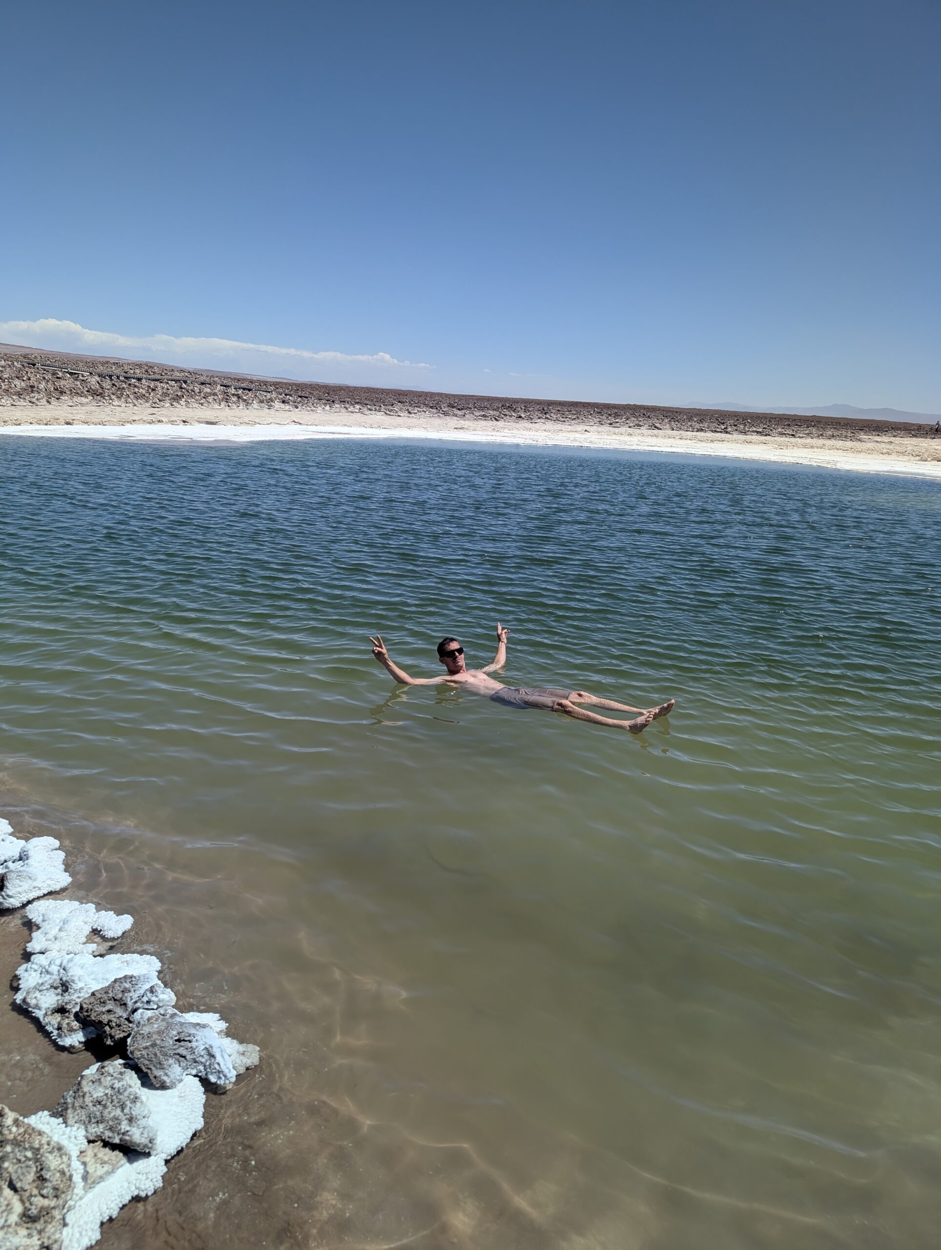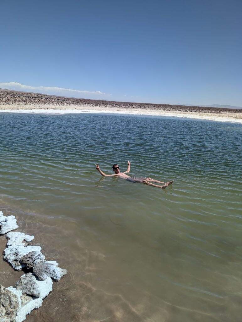 The lakes have 300 grams of salt per litre compared to sea water which has 35 per litre. It was pretty cool. You could float on your back, on your front and you could even stand horizontally without touching the floor…it was impossible to go under the water without really trying, which Dean did and found out how painful salt is in your eyes!